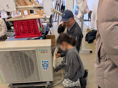 エアコンの仕組みを紹介する動画を見てもらったあと、実際にフィルターの取り外しや配管の取り付けを体験してもらいました🔧